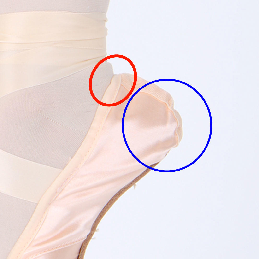 大きいサイズのかかとを見てみると余りが目立ってしまっています。かかとがゆるすぎると、ドゥミをした時にトゥシューズが脱げやすくなってしまいます。