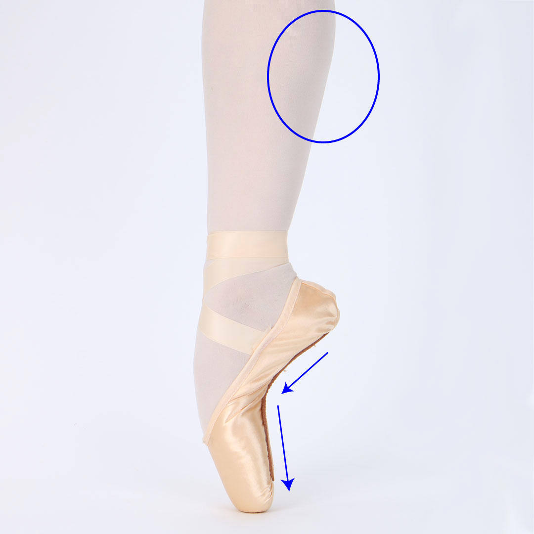 「足裏に力を入れなくても楽々と立てるし、ソールも吸い付いてる!」気がしますが、これはトゥシューズに「乗って」いる状態。かかとが落ちてしまい、全く引き上がって見えません。