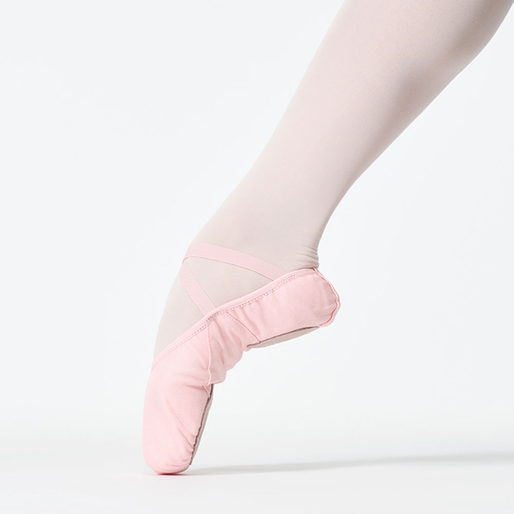 照明を当てても光りにくい、光沢をおさえたマットな質感。土踏まずにゴムを引っ掛けてはくタイプ。新体操におすすめ。