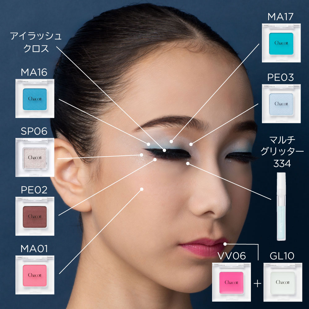 衣装と同系色の爽やかなブルーを目元に入れて統一感を。いつものメイクと差をつけるコツは"ラメ使い"。目尻や目頭に質感の異なるブルー・シルバーベースのラメをプラスすれば華やかな仕上がりになります。リップは目元のブルーを引き立てるようにやわらかで自然なカラーを選ぶのがおすすめ。
