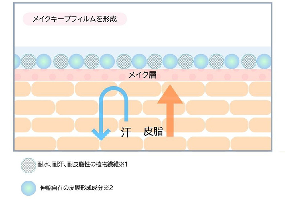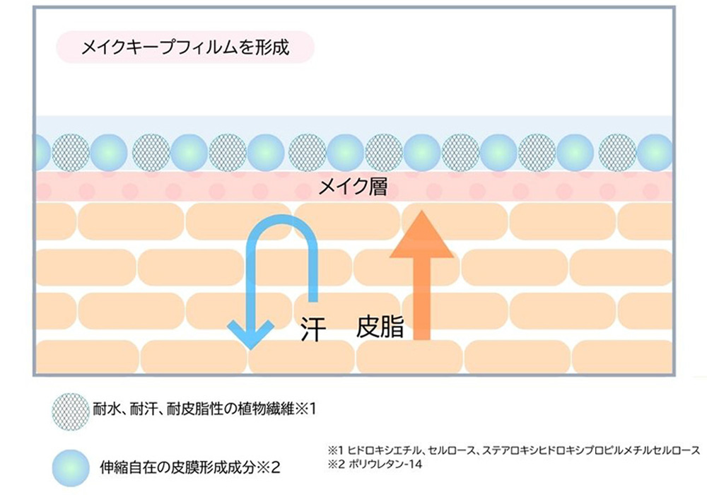 ※1 ヒドロキシエチルセルロース、ステアロキシヒドロキシプロピルメチルセルロース(汗などをまとわりつかせ均一に分散させる網目状の皮膜(フィルム)を形成します。)